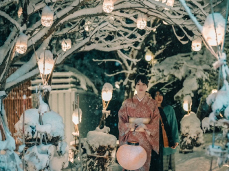 1000坪の静寂を包む日本庭園が光と雪の魔法で幻想的な姿へ。白銀の世界に浮かび上がる光の造形が、煌めきと共に冬の情緒を映し出します。唯一無二の冬景色をどうぞ心ゆくまで。
